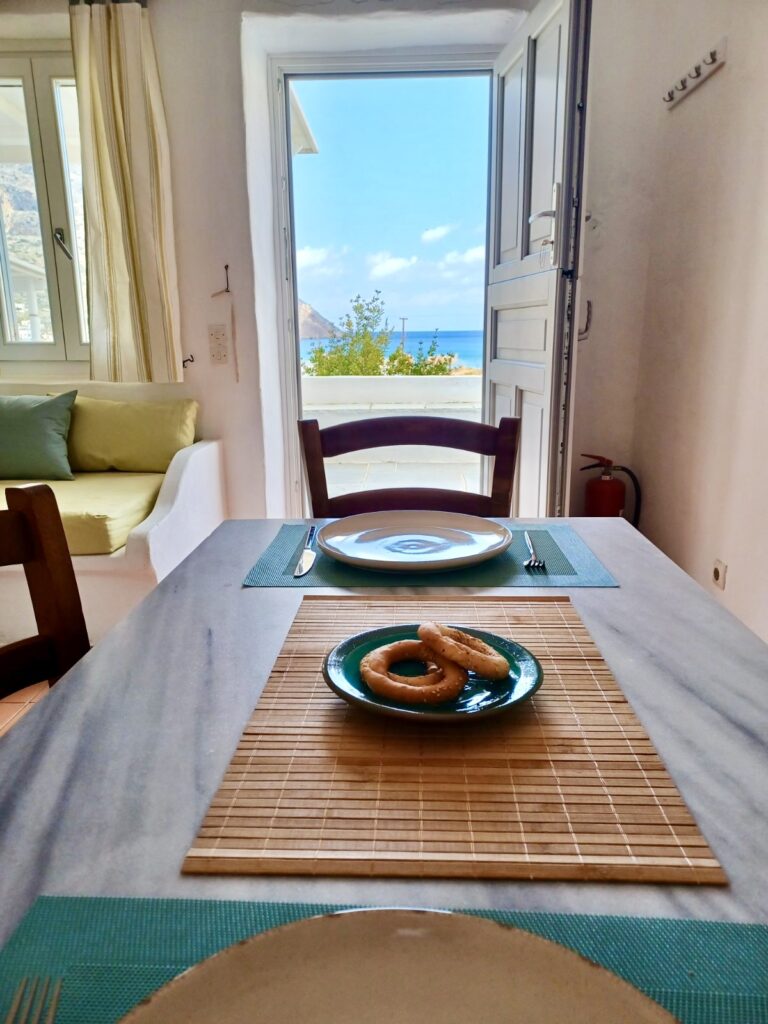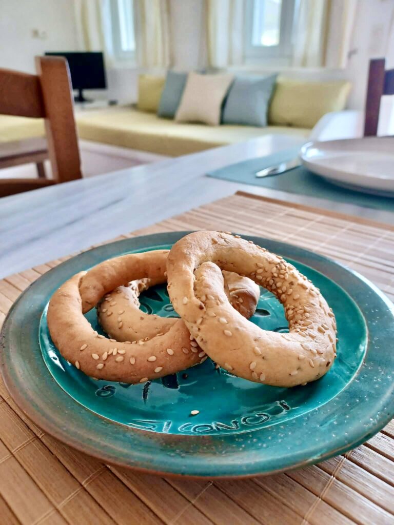 The kitchenette is fully equipped with a mini-fridge (stocked with water, juices, wine, and welcome treats), a two-ring stovetop, an espresso machine with Tassimo capsules, a toaster, an electric Greek coffee maker (briki), and all necessary kitchenware (plates, glasses, cutlery, and cooking pots). A dining table for four is also available.
