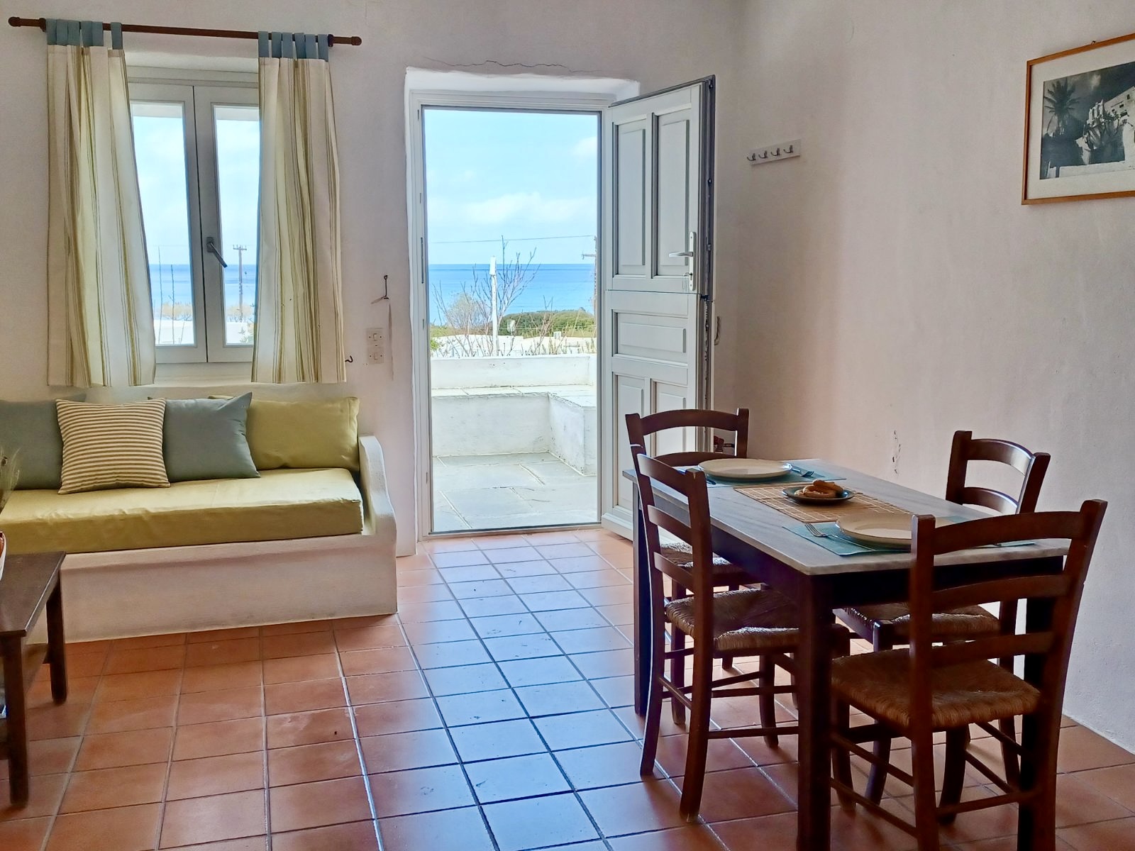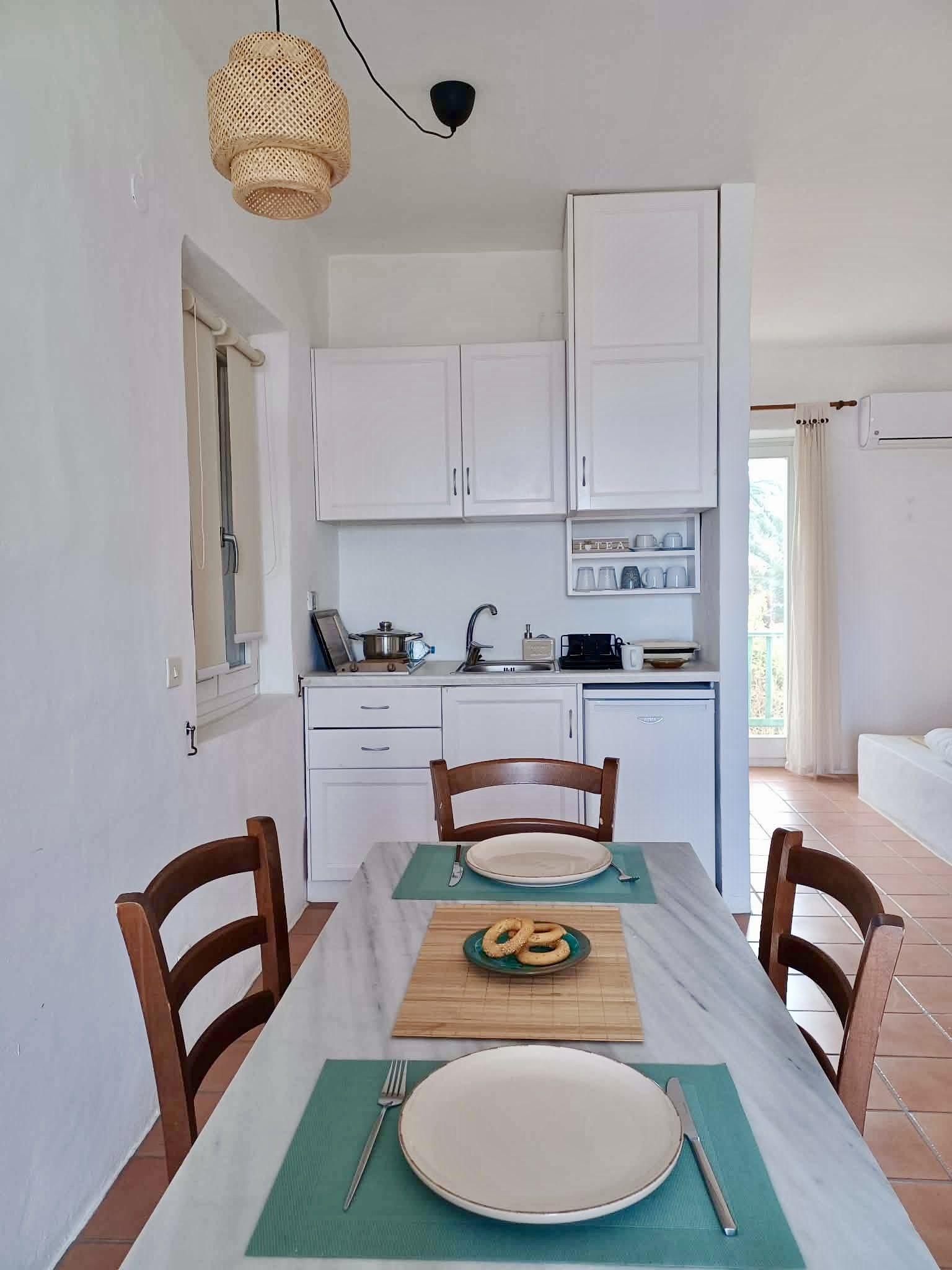 The kitchenette is fully equipped with a mini-fridge (stocked with water, juices, wine, and welcome treats), a two-ring stovetop, an espresso machine with Tassimo capsules, a toaster, an electric Greek coffee maker (briki), and all necessary kitchenware (plates, glasses, cutlery, and cooking pots). A dining table for four is also available.