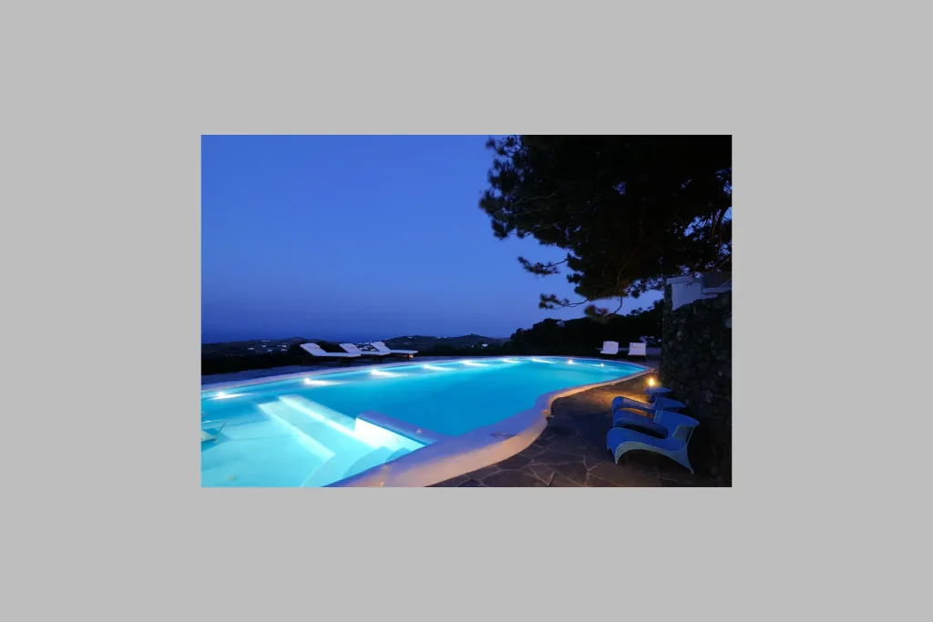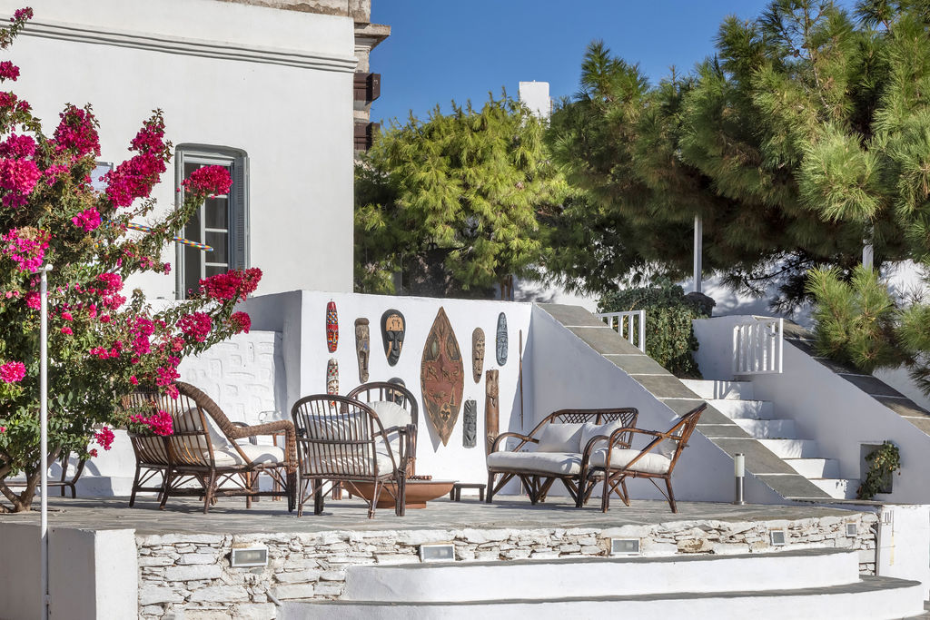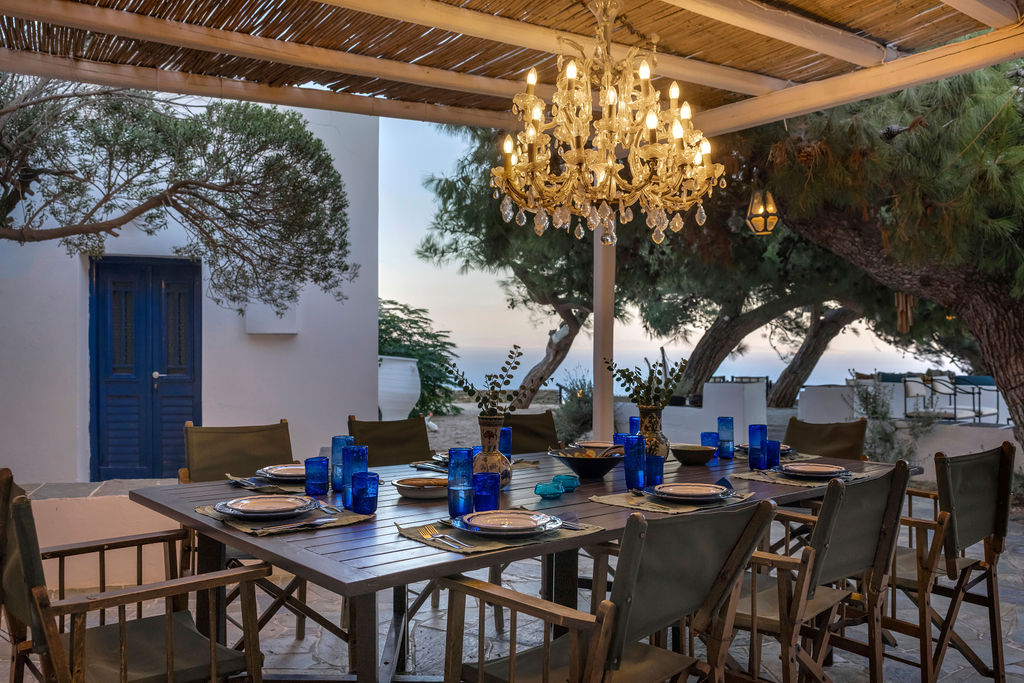 Πισίνα μεγάλων διαστάσεων με υδρομασάζ, ξαπλώστρες με ομπρέλες, εξωτερική τραπεζαρία και BBQ, καθιστικό και διάφορες γωνιές χαλάρωσης, καθώς και ένα εκκλησάκι, την Αγία Αικατερίνη.
