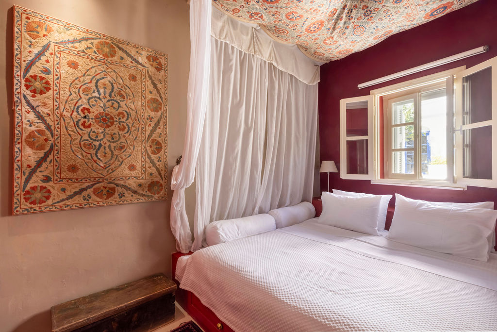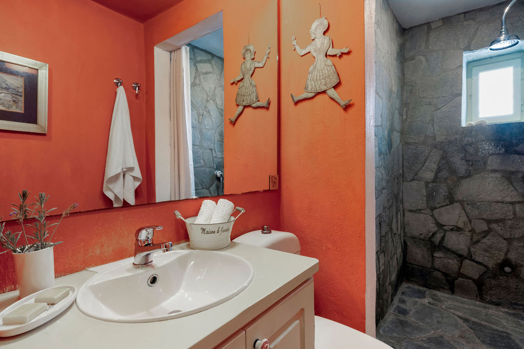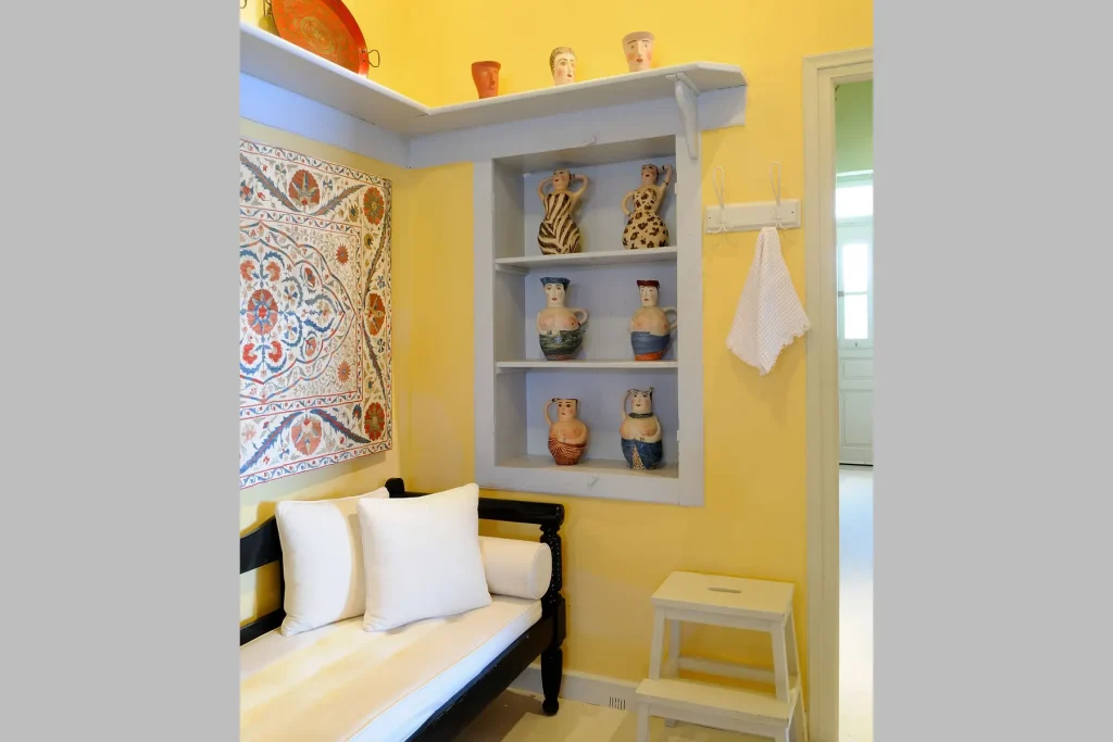 Άνω όροφος: Κεντρικό οίκημα με μεγάλο σαλόνι, ψηλό 4,5μ., πλήρως εξοπλισμένη κουζίνα, τραπεζαρία 14 ατόμων, 5 υπνοδωμάτια με διπλά ή υπέρδιπλα κρεβάτια και μπάνια με ντους, σοφίτα με επιπλέον διπλό κρεβάτι.