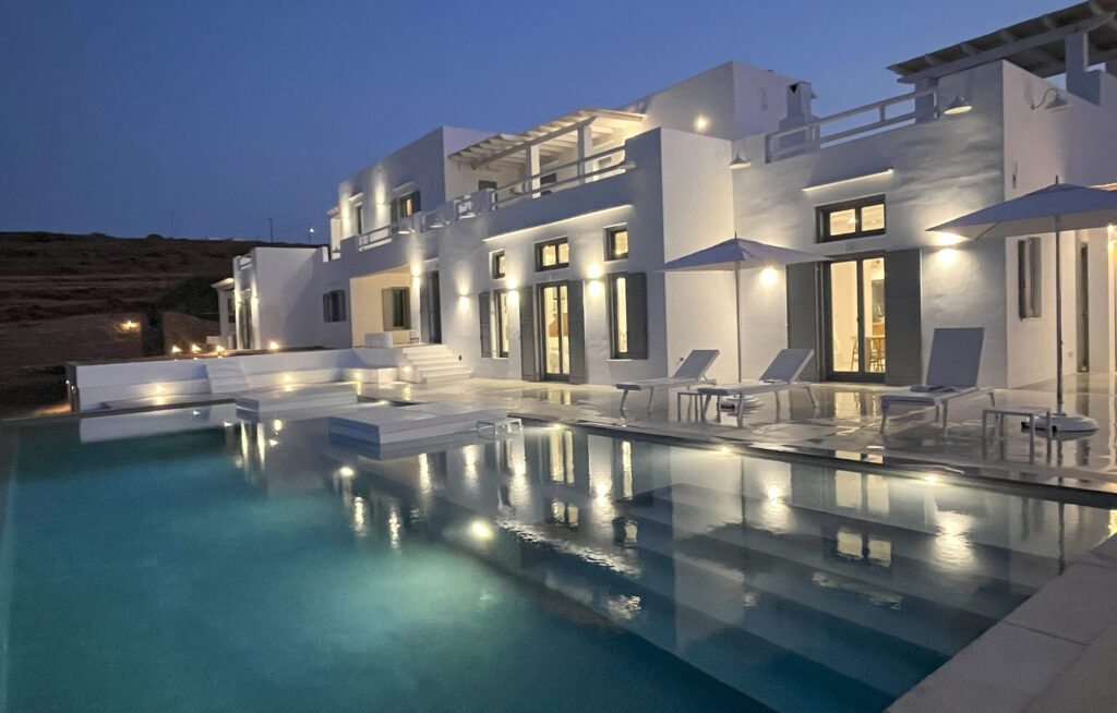 Το εξωτερικό του κτιρίου συμμορφώνεται με αυστηρές οδηγίες κυκλαδίτικης αρχιτεκτονικής για τη διατήρηση του ιστορικού κυκλαδικού χαρακτήρα του νησιού. Από την Άνοιξη μέχρι το Φθινόπωρο, η ζωή περιστρέφεται γύρω από τους μεγάλους υπαίθριους χώρους διαβίωσης και ψυχαγωγίας και την πισίνα 60 τετραγωνικών μέτρων. Η πλήρως ιδιωτική κύρια σουίτα ανοίγει σε τέσσερις βεράντες που προσφέρουν εντυπωσιακή θέα 360 μοιρών στη θάλασσα, το κτήμα και τα βουνά. Η περιοχή είναι καθαρά αγροτική, με ζώα να βόσκουν ήρεμα στα γύρω χωράφια.